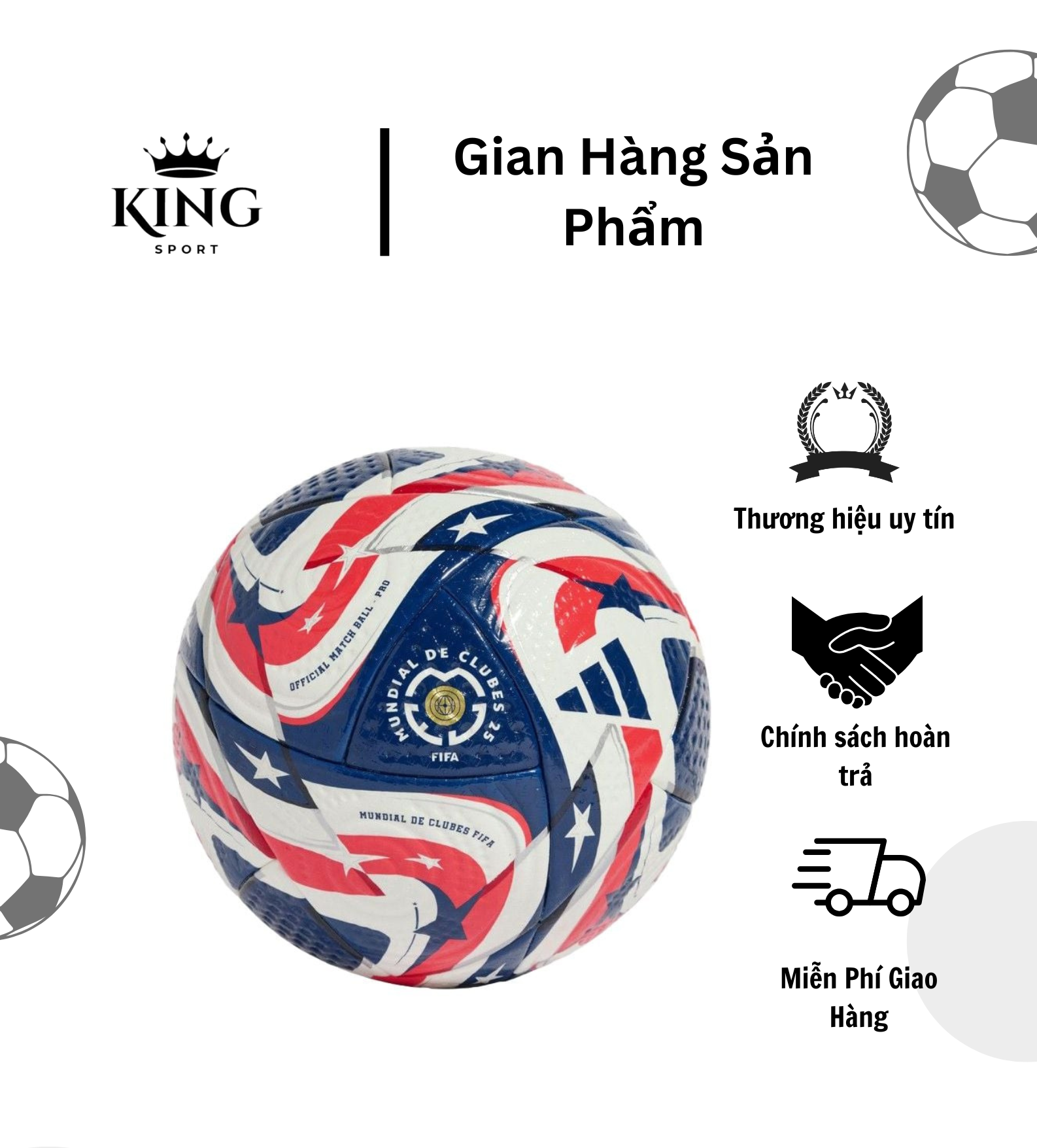 Lấy cảm hứng từ quốc gia kỳ Hoa Kỳ, bóng thi đấu Club World Cup 2025 sở hữu phối màu đỏ, trắng, xanh nổi bật. Trên nền ngọc trai ánh bạc là những họa tiết hình khối răng cưa, xen kẽ các ngôi sao và hào quang cách điệu – tất cả tạo nên một tổng thể vừa hiện đại, vừa tôn vinh di sản văn hóa Mỹ. Ba biểu tượng đặc biệt của Adidas xuất hiện nổi bật, khẳng định dấu ấn thương hiệu trên sân chơi lớn nhất hành tinh cấp CLB.